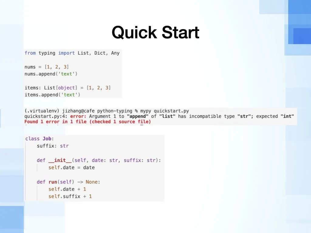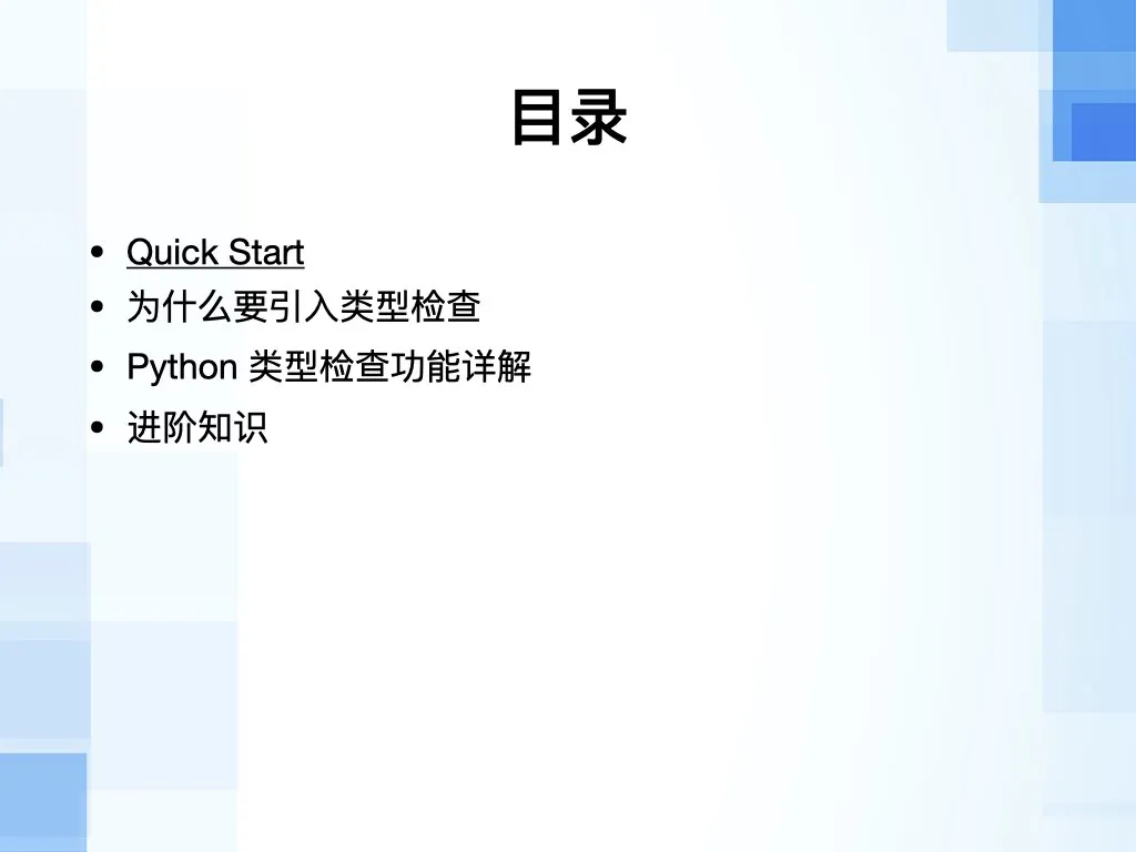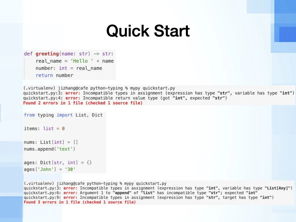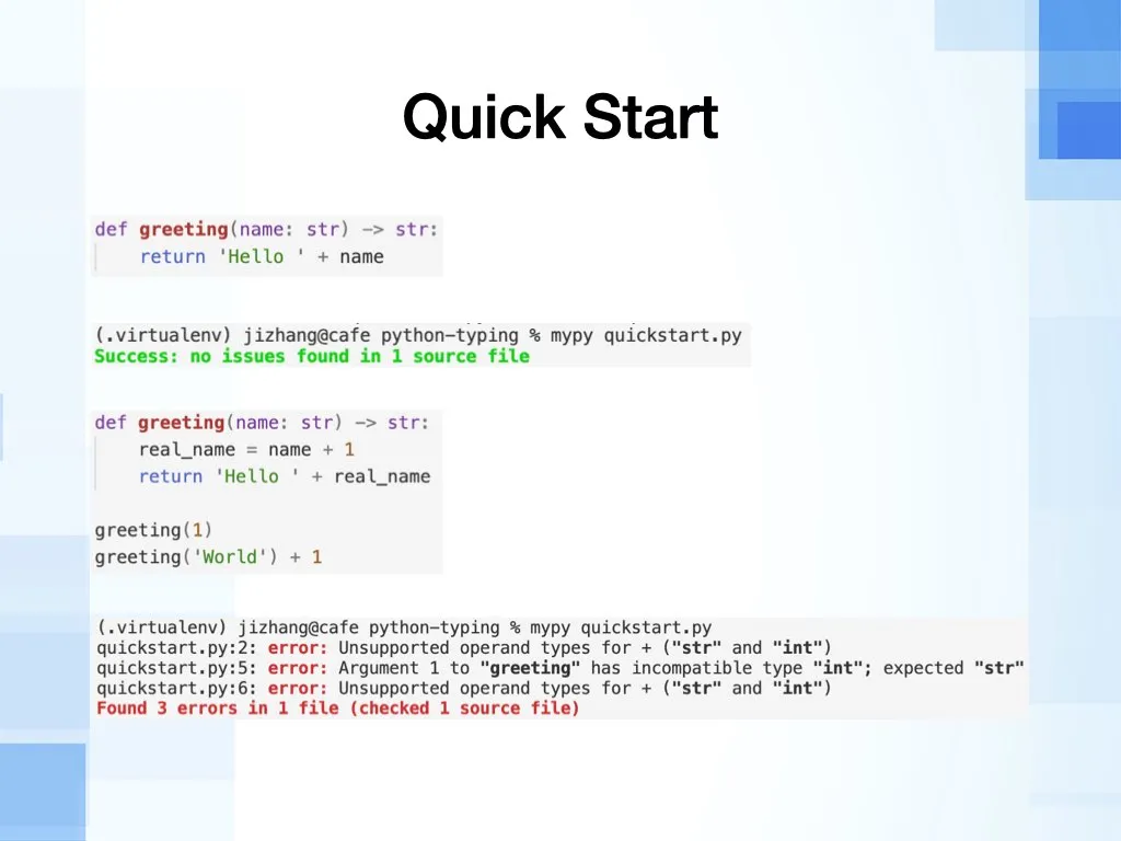 首先我们来快速看一下,Python 中要如何使用静态类型检查。