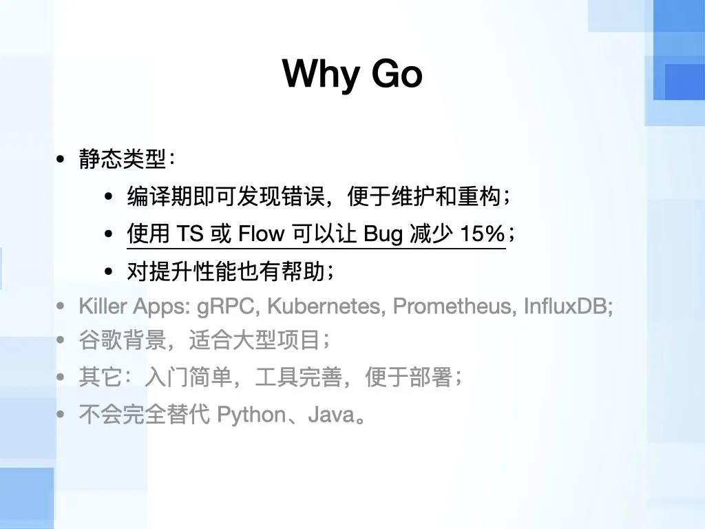 我之前在分享 Learn Go in 10 Minutes 的时候提到过,Go 语言的优点之一是其静态类型系统。静态类型可以在编译期就发现错误,而不用等到程序运行出错时才去修复;而且研究表明,静态类型系统是可以减少 Bug 的数量的,研究者使用的对象是 TypeScript 和 Flow,这两者都为 JavaScript 语言提供了类型检查机制;最后,静态类型系统对程序性能的提升也是有帮助的。