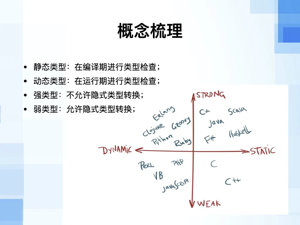 先来梳理几个概念,我们一直会听到静态类型、动态类型、强类型、弱类型等术语。其中,静态类型和动态类型比较容易区分:前者在编译期进行类型检查,后者在运行期进行检查。像 Java、C、Golang 等是比较常见的静态类型语言,而 JavaScript、PHP、Python 等则是动态类型的。强类型和弱类型则比较难以区分了,判断标准是:允许隐式类型转换的程度。比如 JavaScript 是最弱的一门弱类型语言,因为任何类型的变量都可以进行相加等操作,执行引擎会自动做隐式转换;PHP 也是弱类型语言,不过在转换时会报一些 Warning 信息;Python 则是强类型语言,因为当我们将字符串和整型做相加操作时会直接报错。