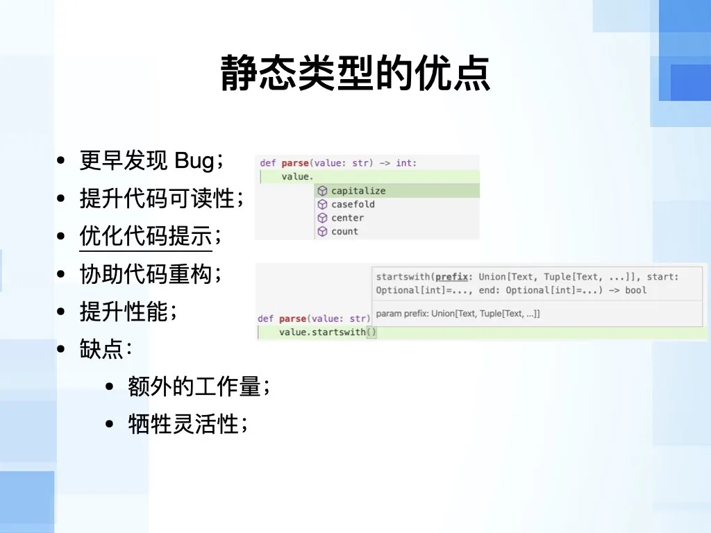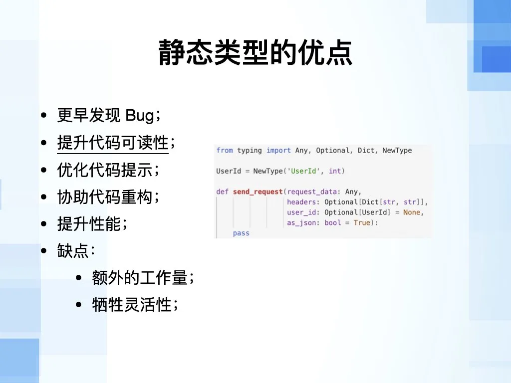 这里列举了静态类型语言的优点,我挑选几条重点讲一下。首先是提升代码可读性,可以看到,函数的参数类型被清楚地标注出来了,如果传入了类型不正确的参数,在编译阶段就会报错。以前我们调用函数时要通过阅读文档或代码来确定参数的类型,有了标注后就可以省去这一步。