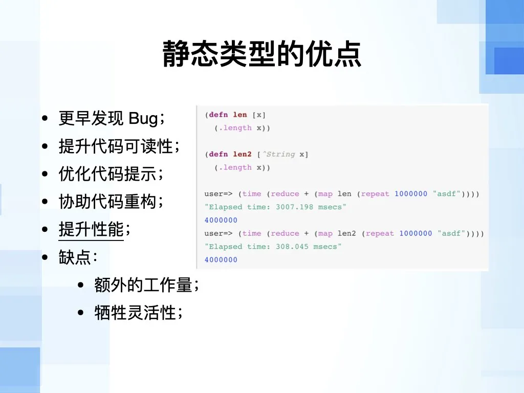 最后是性能提升。首先说明一下,Python 的类型注解在运行期是不会被执行的,目前 Python 的解释器也没有使用类型信息对代码进行优化,所以这里我用 Clojure 作为例子。可以看到,对变量 x