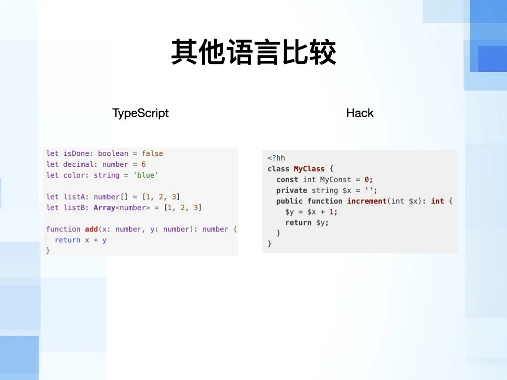 其他动态类型语言也在引入静态类型检查。比如 JavaScript 对应的 TypeScript,以及 PHP 对应的 Hack 语言。它们的方式也和 Python 类似,类型注解是可选的,没有注解的变量不做检查,从而让开发人员可以平滑地切换到静态类型语言。