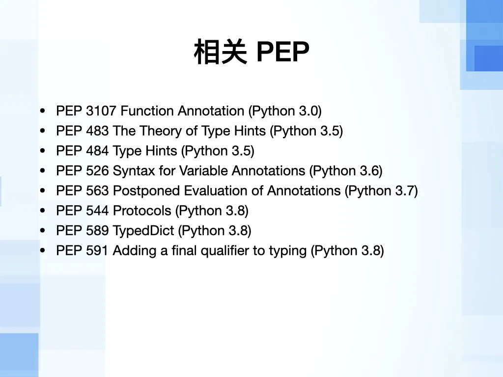 Python 语言引入新特性时都会有相应的 PEP,这里列举了一些和静态类型检查相关且比较重要的 PEP。可以看到,Python 3.0 开始引入了函数参数和返回值的类型注解,但当时并不是专门为静态类型检查设计的。直到 Python 3.5,我们才能正式使用静态类型检查,typing