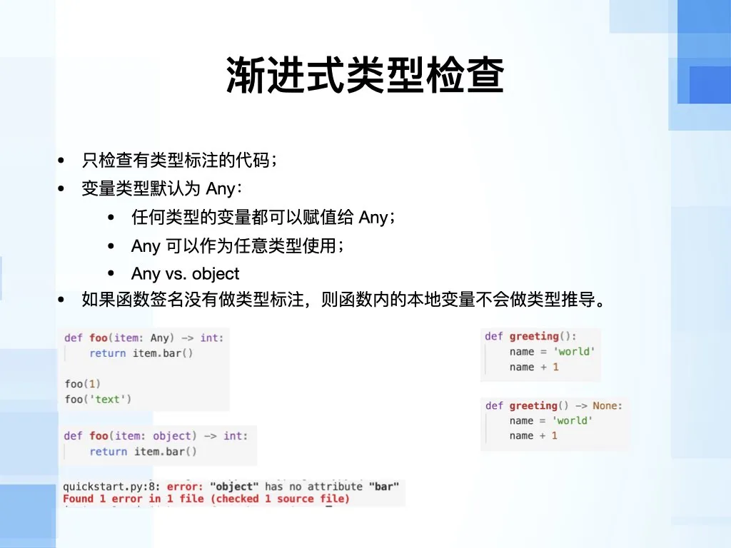 Python 的类型检查是可选的,mypy 只会检查有类型标注的代码,这种做法我们称之为渐进式类型检查。没有标注类型的变量会被定义为 Any