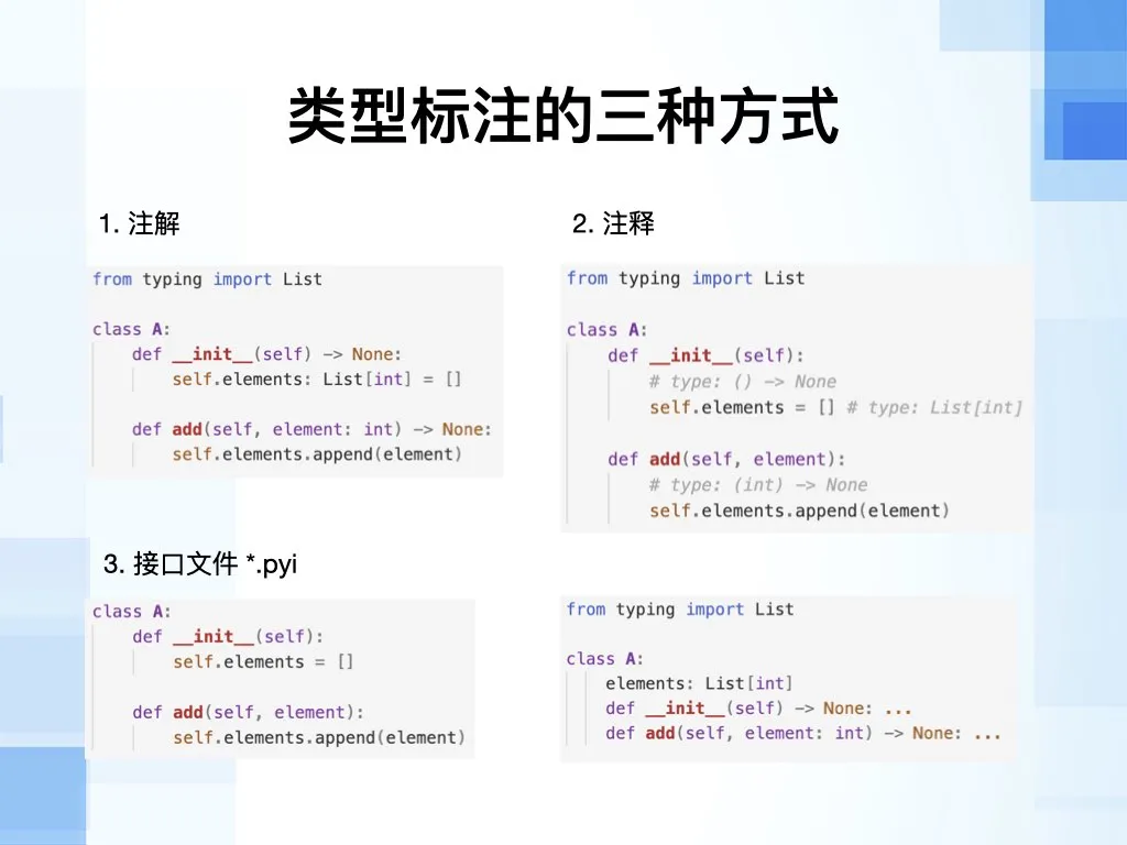 类型标注有三种方式,除了前面一直使用的注解外,还可以通过注释和接口文件来进行。注释的方式主要是为了兼容 Python 2.x,因为低版本的 Python 没有引入注解语法,所以用注释来代替。typing