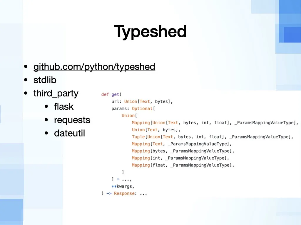 Python 官方维护了一个名为 typeshed 的项目,里面包含了 Python 标准库的接口文件,以及其他一些常用的三方库的类型注解,比如 Flask, requests 等。安装 mypy 时会自动安装 typeshed 项目。