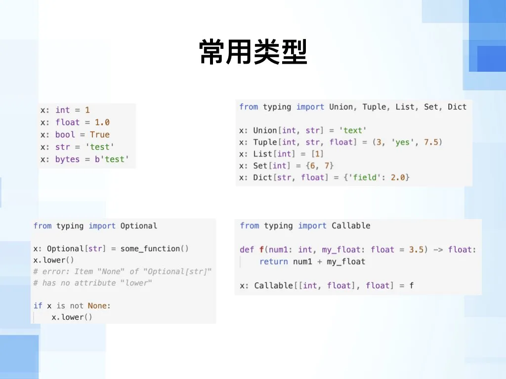 回调类型。当然,类本身也是一种类型,我们下一节会讲。此外还有一些特殊类型,比如 Union[int, str]