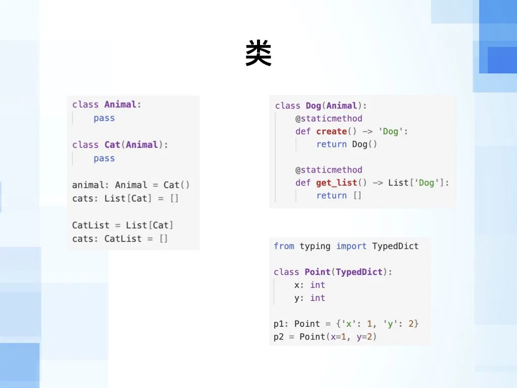 是等价的。对于一些静态方法,比如工厂模式需要返回类本身,定义时类本身还没有被定义完全,因此会报类不存在的错误。这就是之前提到的过早引用问题,解决方法是将类型注解表达成字符串。最后一个例子是 Python 3.8 引入的 TypedDict