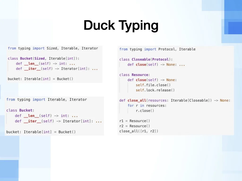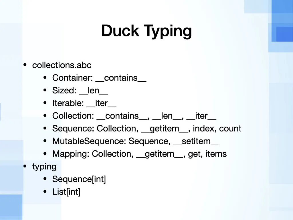 Duck typing 是比较常见的一个概念,当你走路像鸭子、叫声像鸭子,你就是一只鸭子,也就是说我们检查的是类的行为。Python 预定义了一些常用的类型,比如前面提到的 Sized