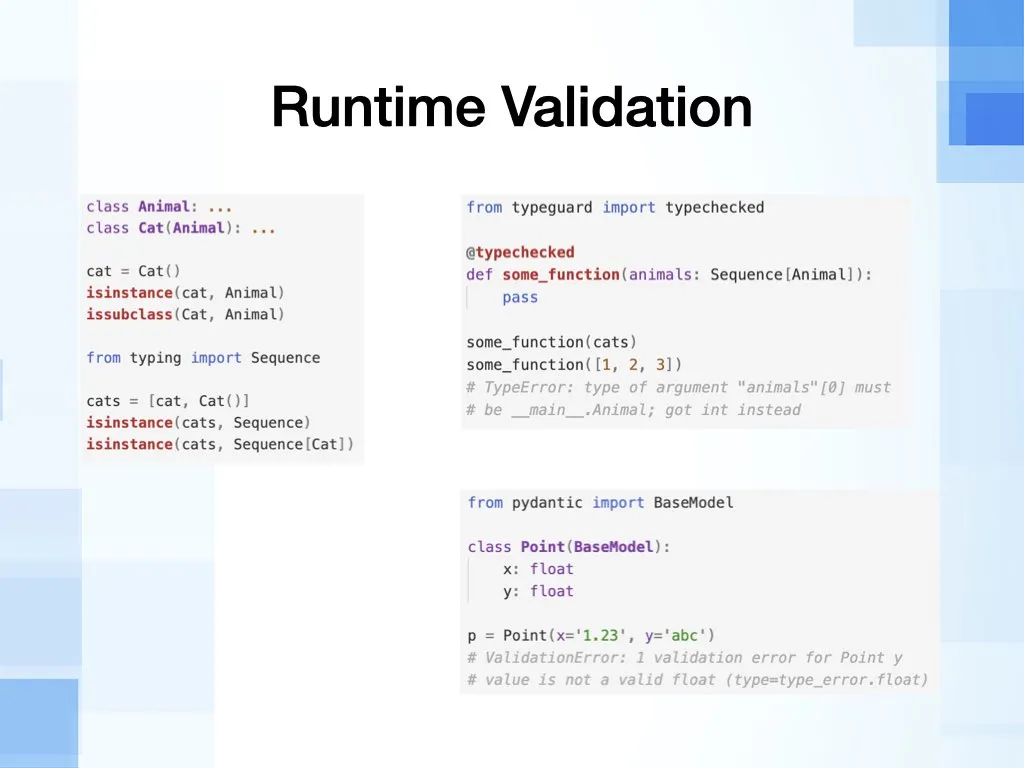 函数。当然,借助第三方库,我们可以将这个检查自动化,比如 typeguard 可以在函数被调用时检查传入的参数类型;pydantic 则能够检查类成员变量是否符合类型注解。